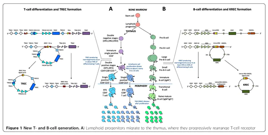 KREC é o subproduto do rearranjo genômico que ocorre durante a maturação dos linfócitos B na medula. O número de cópias de KREC está diretamente relacionado ao número de linfócitos B maduros circulantes no sangue. A redução/ausência de cópias de KREC é observada em recém-nascidos com agamaglobulinemia. Outras linfopenias de células B diferentes de agamaglobulinemia também apresentam redução do número de cópias de KREC.